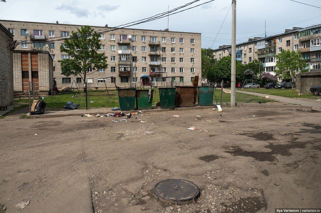 37. Ладно, вернёмся в Ивангород. В Ивангороде большие проблемы с дорогами и мусором. В Нарве тоже с дорогами не идеально, но такого ужаса нет. Заплатки, трещины – пожалуйста. Но вот ям я не нашёл. С мусором в Ивангороде беда серьёзнее. Во-первых, мусорные контейнеры и площадки неправильные. Всё открыто, ветер и птицы разносят отходы по двору.