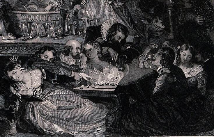 На гравюре изображена игра под названием «Кусающий дракон» (Snapdragon, Flapdragon). Поверьте, азарта и эмоций там было побольше чем в этой вашей дженге. Упоминания этой игры есть в литературе. "Когда всем надоели жмурки, началась славная игра в "кусающего дракона", и когда пальцы были в достаточной мере обожжены, а изюминки выловлены, все уселись возле очага, где ярко пылали дрова, и подан был сытный ужин и огромная чаша уоселя, чуть-чуть поменьше медного котла из прачечной; и в ней так аппетитно на вид и так приятно для слуха шипели и пузырились горячие яблоки, что положительно нельзя было устоять". (Ч. Диккенс" Пиквикский клуб " глава XXVIII) Как играть Вы готовы, мой ягненочек? Доставайте бренди. "Кусающий дракон" - игра, сущность которой состоит в том, что из чаши с горящим коньяком играющие вылавливают пальцами изюм. Огонь перед этим приглушали, чтобы чаша не пылала, а огоньки прыгали по поверхности. Это создавало столь любимую в XIX веке призрачную атмосферу. Выиграл тот, кто на