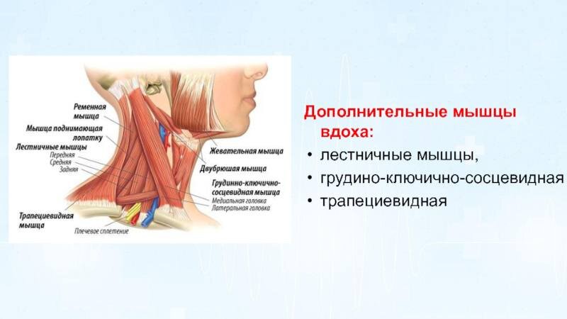 ✔️ перенапряжение вспомогательных мышц вдоха - мышцы шеи, верхняя часть трапециевидной ➡️
