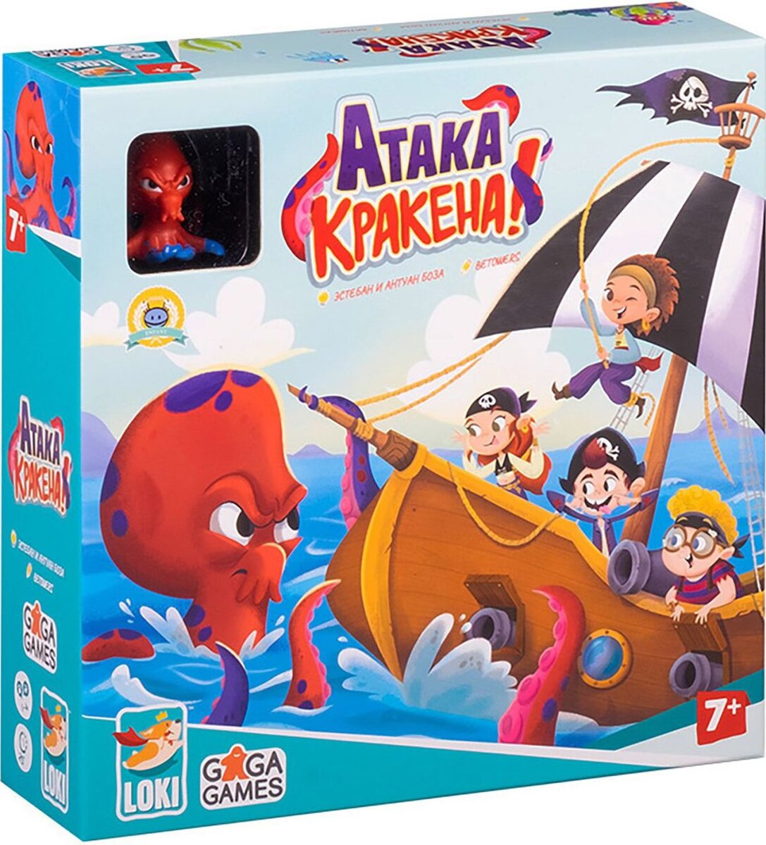 Полундра, нас атакует Кракен! Заряжайте пушки и пистолеты, точите сабли. Дадим отпор чудовищу в кооперативной настольной игре "Атака Кракена" Игра, как я уже сказал, кооперативная, подходит для 1-4 игроков и в ней все игроки одной командой будут сражаться против Кракена, против самой игры. Игроки вместе побеждают если смогут трижды нанести урон Кракену, либо проигрывают, если корабль получит три пробоины. Чтоб нанести урон чудовищу нужно подпустить его поближе к кораблю, для этого его нужно хорошо подразнить. Передвижение Кракена и урон от него определяются кубиками, их игрок бросает в начале хода, затем с помощью карт на руках принимаются ответные меры - движение по кораблю, оружие бьющее на различные дистанции, ремонт корабля. В игре имеется 4 героя, каждый из них обладает уникальными свойствами и имеет свою колоду карт действий. Теперь о наполнении - сказать что все прекрасно, значит не сказать ничего. Деревянные фишки игроков с нанесенным рисунком, пластиковые борта корабля, шупаль