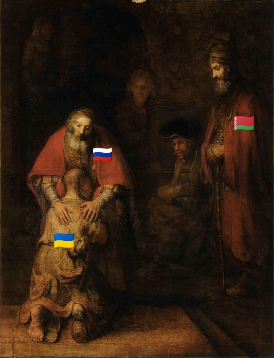 С точки зрения морали, отбросив в сторону политические аспекты, 30-летний вектор движения властей Киева с первого дня независимости сравним с постепенным уходом из семьи, радикально ускорившимся с площади Майдан в 2014 г. Причём шаги в известном направлении не были одинокой попыткой обрести себя в самоутверждении: они сопровождались всем набором инструментов для разрыва многослойной ткани общности - в полном соответствии с давней доктриной иноземцев в отношении семьи. Круг семьи, разумеется, образуют прежде всего Россия, Беларусь и Украина - три государства и народа в постсоветском регионе, имеющие особо тесные связи в силу множества исторических причин. Политическая верхушка сумела представить родное чуждым, чуждое родным, близкое - далёким, далёкое - близким. Легкомысленная власть уготовила Украине судьбу младшего сына из картины Рембрандта «Возвращение блудного сына» по мотивам библейской притчи. Заполучив свою долю семейного имущества младший тут же отправился в дальнюю стор