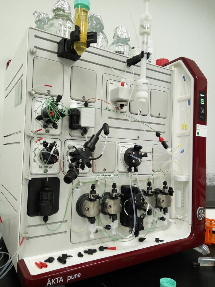 Для того, чтобы пропускать различные растворы с заданными параметрами (нас интересуют, прежде всего, объём и скорость), используются хроматографы. Размерами они бывают от настольных лабораторных (до 150-600 мл/мин), до здоровенных промышленных шкафов, качающих больше 20 литров в минуту. По сути, хроматограф - это насос, клапанная обвязка входа (выбор раствора/продукта), клапанная обвязка колонки (можно пустить поток в обе стороны, либо мимо колонки), блок детекторов (мониторинг параметров - проводимость раствора/солёность, pH, оптическая плотность, температура и т.д.) и клапанная обвязка выхода (слив, либо сбор продукта) и кучка манометров, стоящих в разных местах системы. Выглядеть может как-то так (слева - äkta Pure - до 150мл/мин, в середине - äkta Pilot до 600мл/мин, справа - äkta Ready - до 500 л/ч).