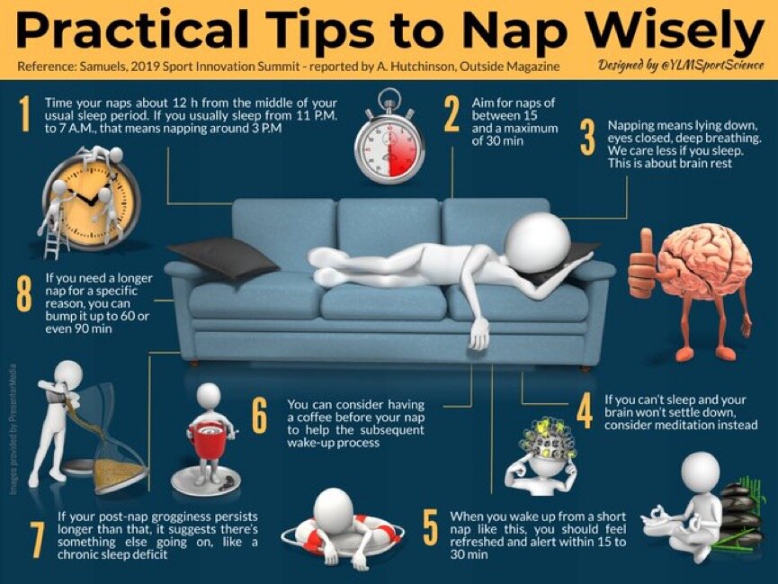 Очередная классная инфографика по материалам Dr Samuels, достаточно известная фигура в спортивной медицине. В чем особенность данной области? Со спортсменами по максимуму стараются избегать таблеток, сами понимаете, допинг и все прочее. Сон— это база работы организма. Нет качественного сна— ничто не поможет. Сон влияет на все, и на ваши психи и на иммунную систему и даже на качество какашки в унитазе. вот так правильно спать днем. вы спите днем? Вам хочется спать в середине дня? PS Также следует учитывать, что если еженедельный дефицит сна составляет 20 часов и более, то у вас есть проблемы, ибо восполнить 20 часов за выходные дни вы не сможете. Если же это 5 часов— то это восполнимо. Всего в неделю предполагается в идеале 50-56 часов сна, это по 7-8 часов в сутки. ✅❌Помните, если вы спите плохо ночью,— дремота или дневной сон НЕ выход из положения. Вы тем самым только усугубите ночные проблемы. Тут нужно решать проблему с ночным сном, а не пытаться ее заглушить дневным. Да, я знаю,