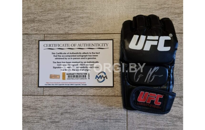 В Беларуси продают на аукционе перчатку с автографом знаменитого ирландского бойца, бывшего чемпиона UFC Конона Макгрегора. Объявление размещено на сайте аукционной площади ЗАО «Белреализация». Начальная цена 2,9 тыс. белорусских рублей или чуть более тысячи долларов. Аукцион запланирован на 31 января. К лоту прилагается сертификат подлинности. Ответственность за то, что он настоящий возлагается на продавца, отмечается в объявлении. Конон Макгрегор — ирландский боец смешанных боевых искусств. Выступает под эгидой UFC (Ultimate Fighting Championship) в легкой весовой категории. Бывший чемпион UFC в легком и полулегком весе.