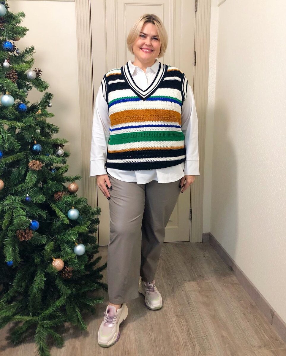 - Комплект из прямых брюк серо-бежевого цвета, рубашки и безрукавки. Брюки классического покроя, без стрелок. Рубашка также имеет прямой силуэт, надета она навыпуск. Третий элемент образа – безрукавка, связанная крючком. Модель связана из пряжи пяти разных цветов узором из горизонтальных полос. Поскольку полосы разной ширины, такой узор не полнит. Дополняют образ светлые кроссовки.