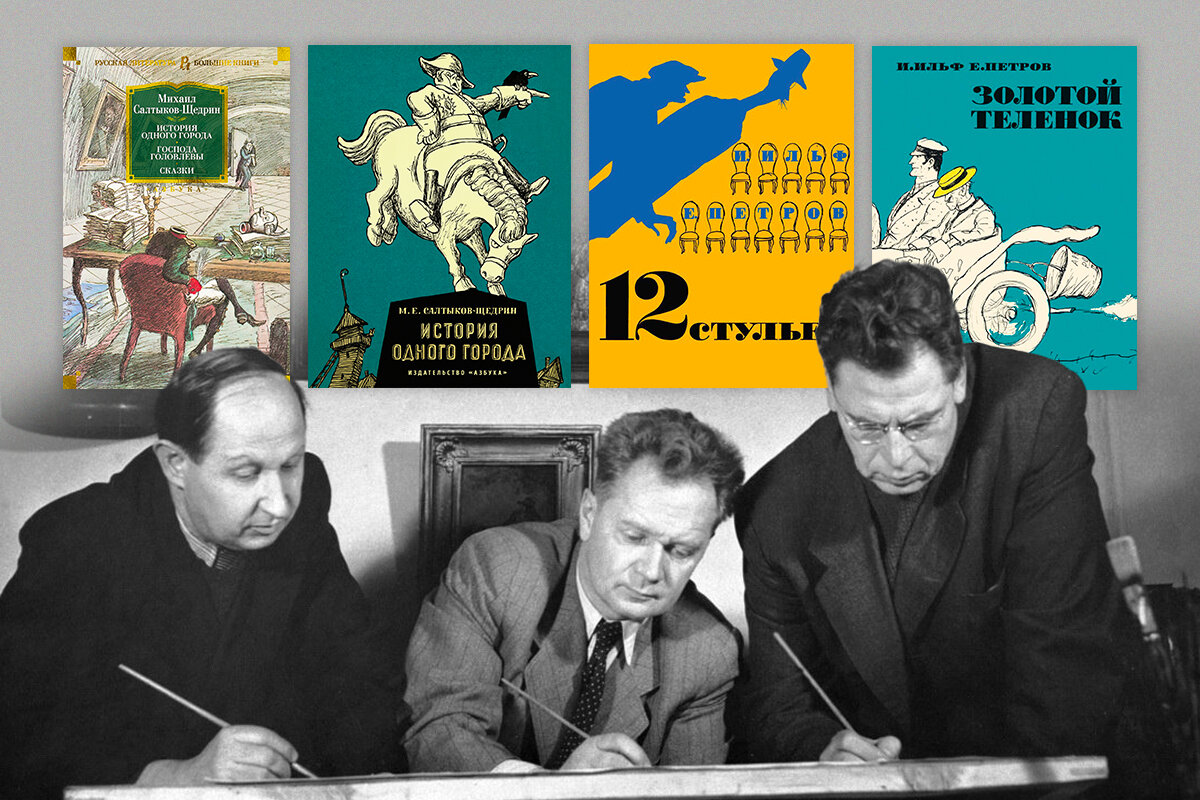 В нашем издательстве вышло несколько изданий с работами Кукрыниксов: «12 стульев» и «Золотой теленок» Ильи Ильф и Евгения Петрова, а также книги Михаила Салтыкова-Щедрина «История одного города» с цветными иллюстрациями и сборник «История одного города. Господа Головлевы. Сказки» с черно-белыми иллюстрациями.