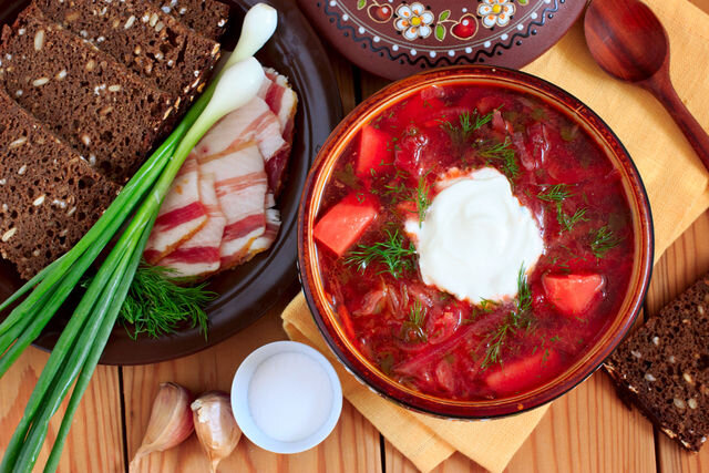 Сейчас борщ стал практически интернациональным блюдом, и если вы хотите порадовать свою семью борщом, выбирайте любой рецепт — украинский с пампушками, молдавский с курицей, , польский с хлебным квасом или сибирский с фрикадельками. Борщ всегда был символом домашнего тепла и уюта, поэтому важно, чтобы он был вкусным и ароматным. Борщ начинается с бульона Борщ обычно варят на крепком мясном бульоне из хорошей говядины, свинины или курятины, и если вы решили использовать говядину, берите грудинку, поскольку она более мягкая и сочная. Если вы готовите мясной бульон, варите его как можно дольше, чтобы он получился более насыщенным. Кости варят 5–6 часов, а мясо — около 2,5 часов, только не забывайте снимать пену. В процессе варки к мясу можно добавить головку лука, морковь, сельдерей и пучок зелени, чтобы обогатить вкус бульона. После окончания варки овощи вынимают из кастрюли, бульон процеживают, мясо отделяют от костей, нарезают на кусочки и добавляют к