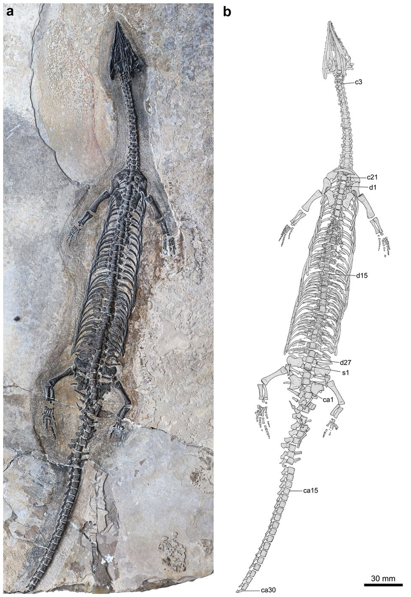Когда мы говорим о завроптеригиях, то естественно вспоминаем плезиозавров - эласмозаврах, плиозаврах и им подобным. Чуть реже - о плакодонтах и нотозаврах. А теперь, похоже, придётся выделять и новую группу - пахиплеврозавров, у которых недавно случилось пополнение. Короче говоря, встречайте - лопинозавр (Luopingosaurus imparilis Xu et al., 2023), один из первых описанных в этом году ящеров. Обитал он в анизийском веке триасового периода, около 244 млн лет назад в уезде Лопин, провинция Юньнань. Описали его по почти полностью сохранившемуся скелету длиной 46,2 см, причём сохранился он с вентральной стороны, то есть, пузом к верху. Родовое название, как мы можем понять, было дано в честь места находки, а вот видовое - "импарилис" - в переводе с латыни означает "необычный" или "своеобразный". Чем же он такое заслужил? Для начала давайте вспомним, кто такие эти пахиплеврозавры. Это - группа небольших завроптеригий, обладавшая ещё вполне себе земными конечностями, а не плавниками, как их б
