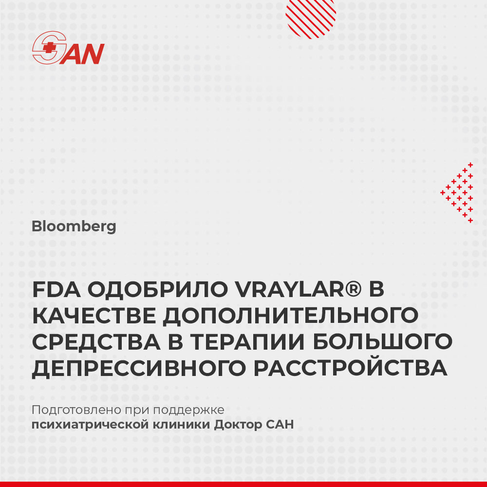 Большое депрессивное расстройство (БДР) – одно из наиболее распространенных психических расстройств в США. Примерно каждый пятый взрослый подвергается ему в течение жизни. При приеме антидепрессантов симптомы депрессии могут сохраняться у ряда пациентов. Если это происходит, часто второй препарат, добавленный к схеме лечения, может помочь улучшить состояние. Существующий препарат VRAYLAR® (карипразин), разработанный для лечения взрослых с депрессивными, острыми маниакальными и смешанными эпизодами, связанными с биполярным расстройством I типа и шизофренией, теперь имеет четвертое показание. Компания AbbVie объявила 16 декабря 2022 г. в пресс-релизе, что FDA одобрило VRAYLAR® в качестве дополнения к антидепрессантам в терапии БДР у взрослых. Таким образом, VRAYLAR® – это первый и единственный частичный агонист дофамина и серотонина, разрешенный к использованию в терапии наиболее распространенных форм депрессии. Подробнее о лечении депрессии: https://doctorsan.ru/lechenie-depressii