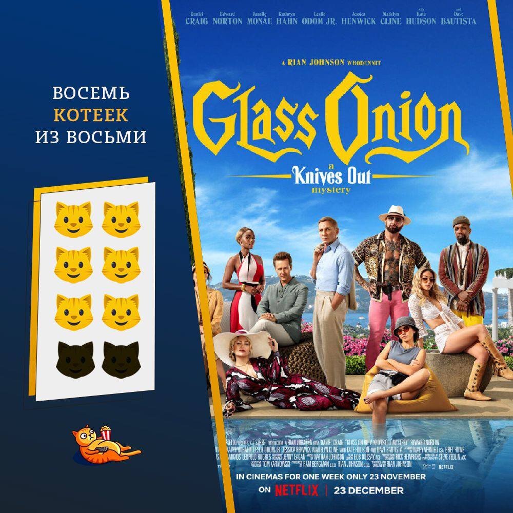 🔹 13+ Долгожданная премьера. Честно, сейчас уже и не помню сколько котеек получил первый фильм "Достать ножи". Да оно и неважно :) Второй фильм я ждала. Старалась не попадать на кадры, статьи, спойлеры. Хотелось максимум неизвестности перед просмотром. Второй фильм меня не разочаровал. Увидев хронометраж в 2,2 ч, я сразу представила как через час потеряю всякий интерес к фильму и начну заниматься своими делами. Но этого не произошло. Посмотрела на одном дыхании, не заметив как прошло время. История, как и в первом фильме, порадовала. Хорошо закрученный детектив. Завязка в целом проста: эксцентричный богач приглашает на свой частный остров в Греции достаточно разношерстную компанию давних друзей, чтобы они раскрыли его убийство. Звучит странно, да, но интригует. Убийцу" мне удалось раскрыть для себя где-то на середине картины :) Актерский состав приятно удивляет и, стоит отметить, от начала и до конца фильма. Много неожиданных камео (боль