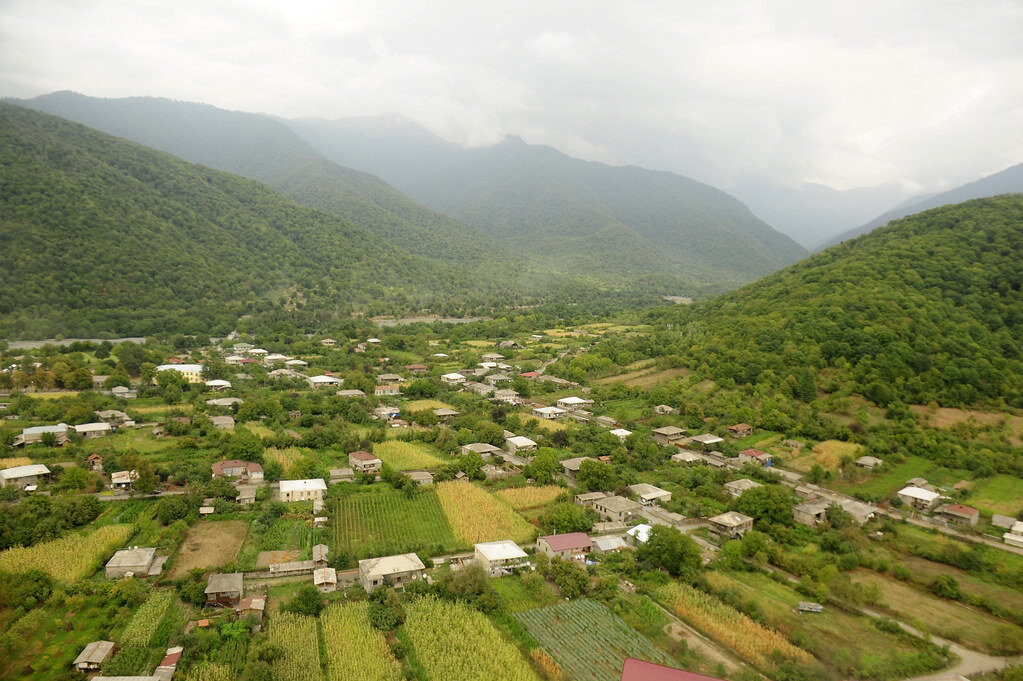 Утром мы позавтракали, собрали поклажу и продолжили путь. Через какое то время тропа ушла в сторону от высохшего русла и стала понемногу забирать все выше и выше по склону горы. Идти стало тяжелее. Сзади послышался шум – нас нагонял паренек лет 16-ти. Он толкал перед собой велосипед. Как водится, разговорились, он тоже направлялся в Грузию, только в другое село. Пошли вместе. Сложили наши рюкзаки на велик и вместе стали толкать его все выше и выше в гору. Въехали в лес, растущий на склоне и стало еще тяжелее – поваленные деревья, кустарник, и все круче и круче вверх. Через каждые полчаса приходилось делать привал. Короче измотались конкретно. Но когда мы наконец то поднялись на перевал, то были вознаграждены завораживающим видом. Перед нами лежала Грузия! Пришвин, наверное, попытался бы описать бескрайний пейзаж, открывающийся с высоты птичьего полета, эти зеленые пологие склоны, совсем не похожие на скалы Дагестана, живописную долину далеко внизу и этот простор, от которого захватывает дух! Не знаю, что бы получилось у Пришвина, а я могу лишь сказать, что это было очень красиво и величественно.