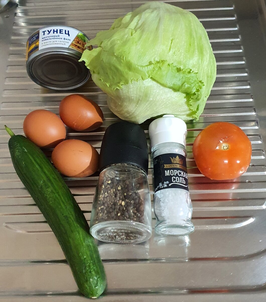 Устали от тяжелой пищи и обилия майонезных салатов? Тогда этот рецепт придется вам по вкусу! Этот простой, но очень гармоничный по вкусу салат готовится просто и достаточно быстро - пока варятся яйца, можно подготовить остальные компоненты. Ингредиенты: - салат "Айсберг" 1/4 среднего качана - яйцо куриное 3 штуки - тунец в масле для салатов 1 банка 170 грамм - огурец 150 грамм - помидор 150 грамм - репчатый лук, соль и черный молотый перец по вкусу Яйца отварить в крутую, очистить. Два яйца порезать кубиком. Одно яйцо разрезаем на 4 дольки. Это яйцо будем использовать для украшения нашего салата. Салат промыть, высушить и нарезать достаточно крупным кубиком. Огурец нарезаем полукольцами. Помидор нарезаем кубиком. Лук очищаем и нарезаем полукольцами. Соединяем все ингредиенты кроме яйца для украшения в миске. Консерву отправляем в миску со всей жидкостью, она будет служить нам заправкой. Тщательно перемешиваем. Выкладываем в салатник и украшаем четвертинками яйца. Прия