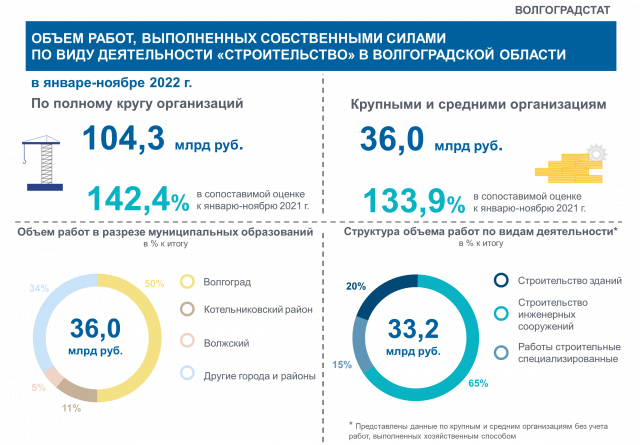 Волгоградские компании с января по ноябрь 2022 года выполнили собственными силами работы по виду деятельности «Строительство» на 104,3 млрд рублей. В сопоставимой оценке к январю-ноябрю 2021 года это составило 142,4%. Как сообщает пресс-служба Волгоградстата, крупными и средними предприятиями выполнены строительные работы на 36 млрд рублей. При этом основная часть работ выполнена в Волгограде – 50,4%, в Волжском – 5%, в Котельниковском районе – 10,7%. «Из них на работы по договорам строительного подряда без учета работ, выполненных хозяйственным способом, пришлось 33,2 млрд рублей, где основными видами деятельности являются «Строительство инженерных сооружений» – 65,3%, «Строительство зданий» – 19,5%, «Работы строительные специализированные» – 15,2%», - уточнили в статистическом ведомстве.