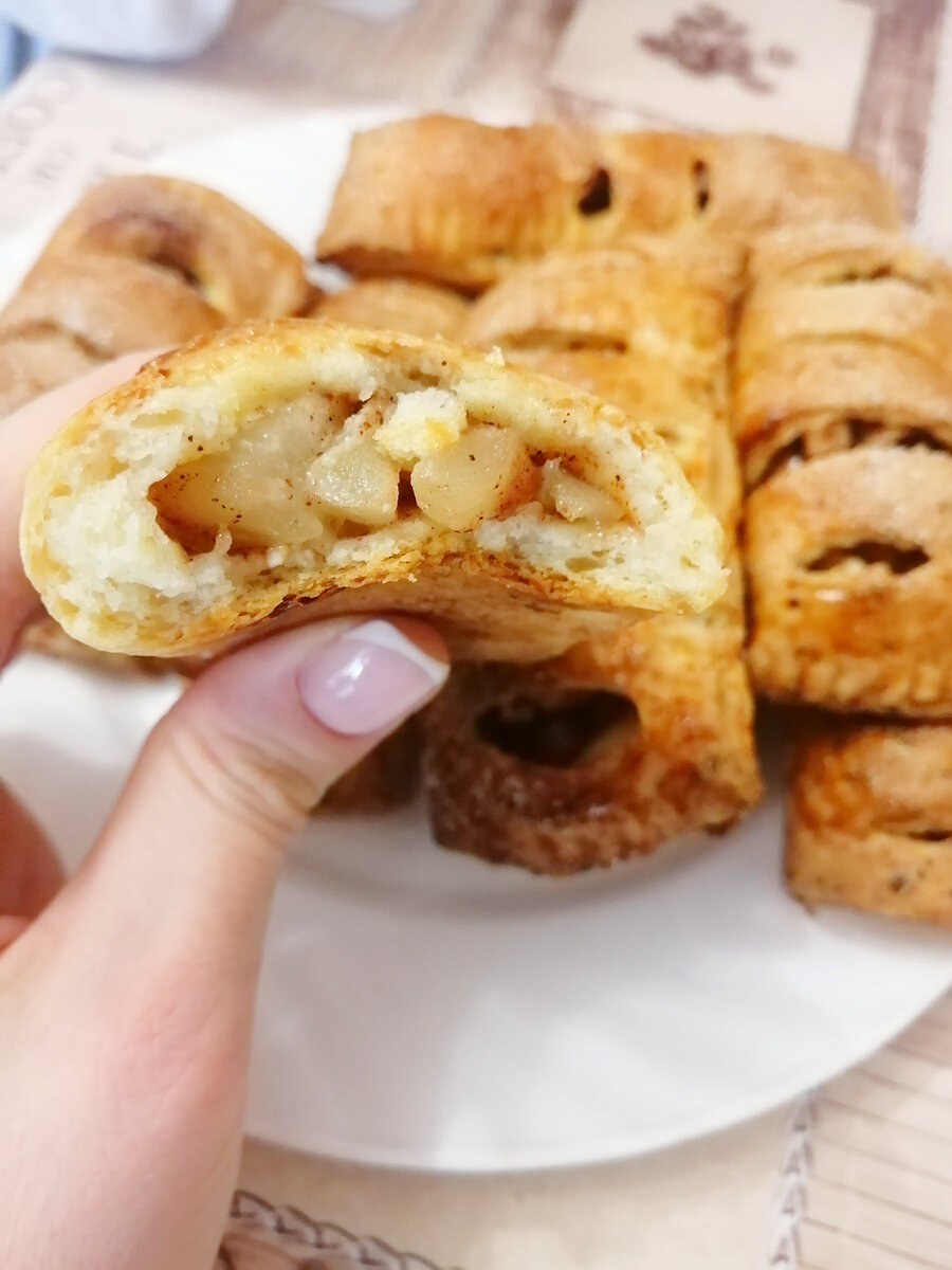 Когда хочется чего-то вкусненького домашнего, то этот рецепт для Вас. Ингредиенты : Тесто: 1.Творог-300 грамм, любая жирность 2.Яйцо-1 шт. 3.Сахар - 1 ст. ложка 4.Сливочное масло - 100 г 5.Мука - 300 г (12 столовых ложек) 6.Разрыхлитель - 1ч.л Начинка: 1.Яблоки-3 больших 2.Лимонный сок-2 ст. л. 3.Корица - 1 ч. л. 4.Сахар 50 г. (2 ст. л.) 5.Кукурузный крахмал-2 ст. л. 6.Желток и сахар для посыпки. Начнем. Берём творог, в него разбиваем яйцо, сыпем сахар, и перемешиваем. Добавляем растопленное сливочное масло, перемешиваем. Добавляем муку, разрыхлитель, и вымешиваем тесто. Убираем тесто на 30 минут в холодильник. Этим временем очищаем яблоки от кожуры, мелко нарезаем на кубики, поливаем лимонным соком, посыпаем корицей и кукурузным крахмалом. Вытаскиваем тесто с холодильника. Нарезаем квадратами тесто, предварительно раскатав его, не очень тонко. Делаем надрезы на одной стороне квадрата, на другую выкладываем начинку. Закрываем кармашка, защипляя по краям пальцами или вилкой.