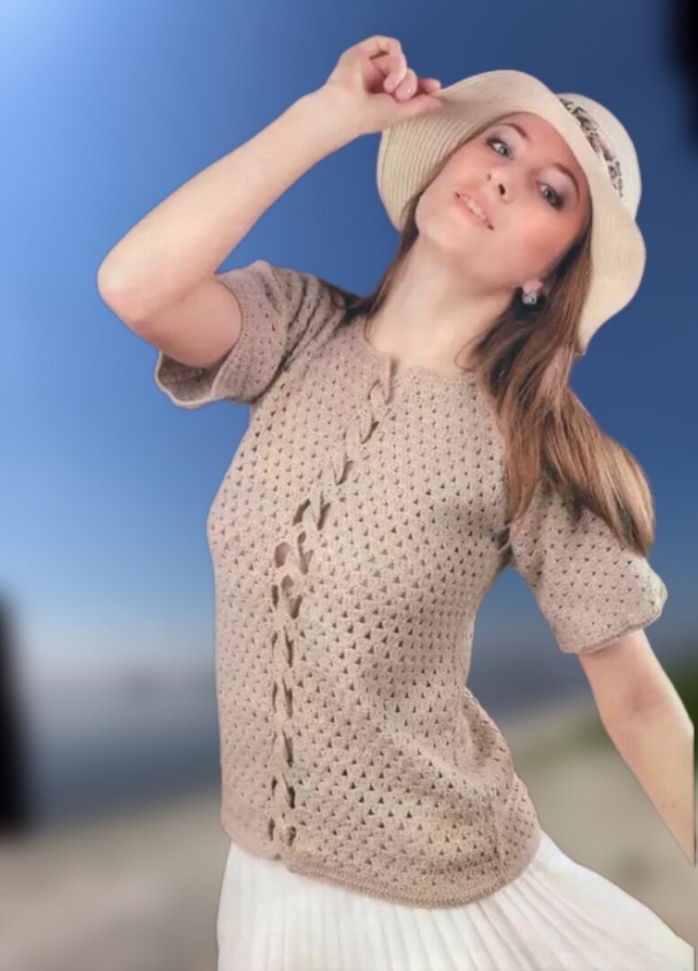 Сборка: выполните плечевые швы. Обвяжите вырез горловины и края рукавов 1 рядом ст. с/н. Затем соедините правую и левую детали следующим образом: по краю правой полочки провяжите *3 ст. с/н, наберите 9 возд. п., пропустите 4 см основания (=8 п.)* повторяйте *-*. Затем провяжите 1 ряд ст. с/н. Край левой детали обвяжите аналогично, но при выполнении арочек продевайте цепочку через арочки правой детали. Выполните боковые швы и швы рукавов.