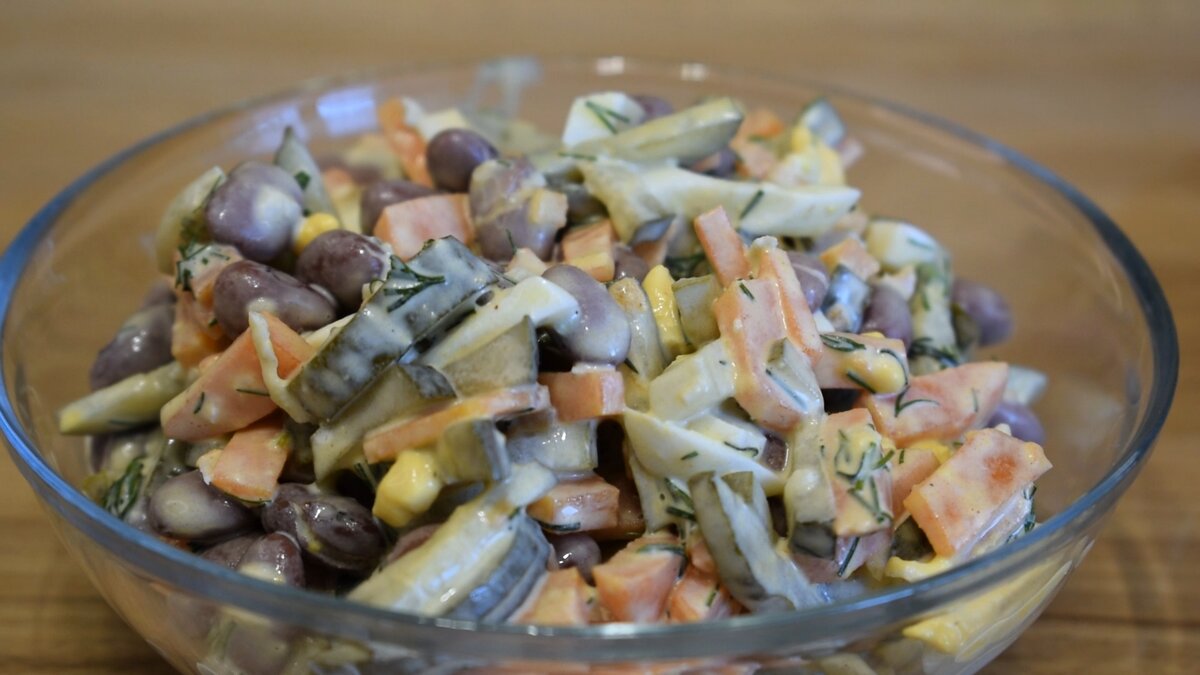 Ингредиенты: Яйцо - 3 шт Фасоль консервированная – 1 банка Огурцы соленые – 4 шт Морковь – 1 шт Укроп Майонез – 3 ст.л. Чеснок – 1 зубчик Черный молотый перец Рецепт приготовления: Отварить морковь и яйца, в одной кастрюле, в течении 15 минут. Кладем в миску мелко нарезанные соленые огурцы, консервированную фасоль, нарезанные вареные яйца, и нарезанную морковь отварную. Приготовим заправку для салата! В миску кладем нарезанный укроп, чеснок через пресс, майонез и черный молотый перец. Перемешиваем. Заправляем салат и тщательно перемешаем! Такой салат можно подавать к ужину, или вместо ужина! Приятного аппетита! Кстати, я ранее уже делился этим рецептом на своём канале, в формате видео. Переходите и смотрите. Так же рекомендую посмотреть: Самый бюджетный рецепт салата. Готовлю часто вместо ужина. Вкусно, просто и быстро Мой "Ходовой" САЛАТ, который побил все рекорды по скорости приготовления! Готовится быстро и просто, всего несколько простых продуктов в составе! Можно и на праздничный