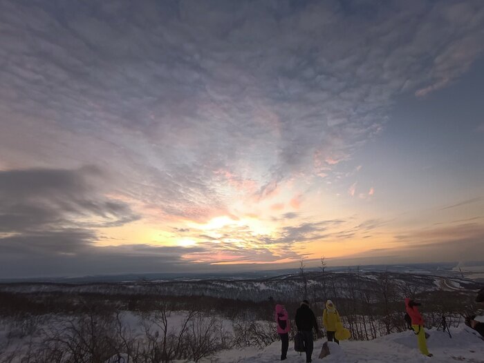 Есть у нас в городе прекрасная и поистине народная традиция - встречать первый рассвет после полярной ночи. Не всегда удается прям увидеть солнце в первый же день - максимум вот такие отсветы на облаках. Ноооо! Даже они радуют неимоверно! Все, пережили тьму и мрак, дальше будет хорошо. Встреча рассвета происходит на сопке в черте города, администрация города чаёк подвозит, угощает, музыка играет, хороводы водят - потому что просто так стоять ждать невозможно, ветер всегда сильный. На память выдают значок) Первый официальный день длится 32 минуты, но уже к середине апреля мы будем ныть и страдать, почему так светло ночами, где там мои блэкауты, пора вешать! Читайте также.