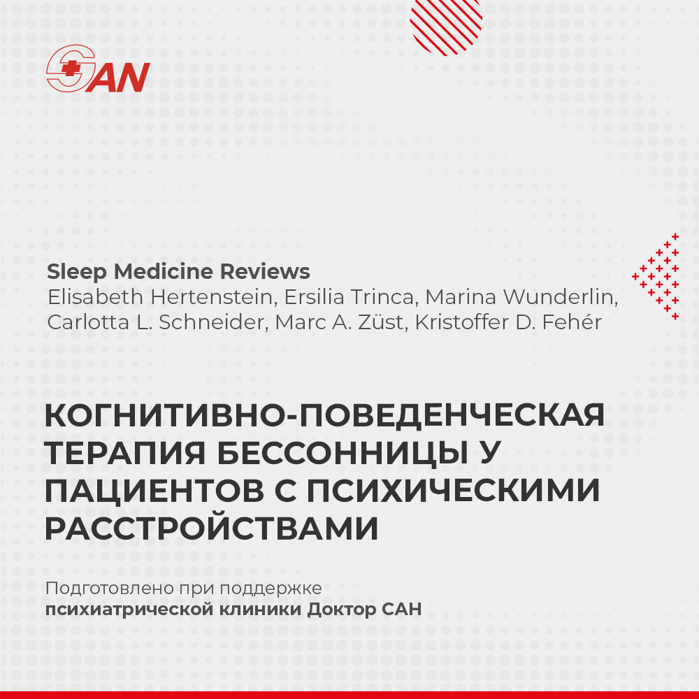 Почти 70% пациентов с психическими расстройствами сообщают о нарушениях сна, а 30% соответствуют критериям бессонницы. Согласно текущим рекомендациям по лечению бессонницы, когнитивно-поведенческая терапия бессонницы (КПТ-I) является лечением первой линии. Несмотря на это обстоятельство, бессонницу часто лечат только фармакологически, особенно у пациентов с психическими расстройствами. КПТ-I оказалась эффективным средством лечения пациентов с бессонницей и сопутствующими психическими расстройствами; она дает стабильные эффекты от средних до значительных, особенно у пациентов с депрессией, ПТСР и алкогольной зависимостью. КПТ-I также эффективна в качестве дополнительного лечения, улучшающего общее психическое состояние пациентов с депрессией, ПТСР, и уменьшающего тяжесть симптомов у амбулаторных пациентов со смешанными диагнозами. Таким образом, учитывая побочные эффекты фармакотерапии, у пациентов с психическими расстройствами и сопутствующей бессонницей КПТ-I следует рассматривать в к