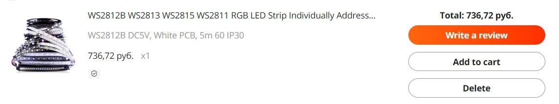 Чем так хороши адресные диоды? Ну во-первых они позволяют получить эффекты, за счет возможности управления каждым диодом индивидуально на большой скорости. А во-вторых, для питания такой ленты, нужен только блок питания, а управление обеспечит маленький контроллер без специфических силовых транзисторов. В-третьих, возможность деления ленты на нужный метраж. 24В ленты кратны шести диодам, 12В ленты кратны трем, а адресные можно отрезать в любом месте. Это очень важный параметр при дизайне интерьера. В-четвертых, цена лент стала низкой и уже близка к стоимости классических RGB лент, хотя это странно, классические RGB ленты подорожали, а адресные подешевели... Вот скрин покупки 5-метровой ленты с плотностью 60 диодов: