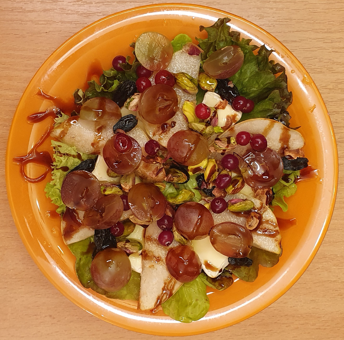 Это продолжение моего цикла «Новогодний стол», а начало тут: Этот легкий салат – просто взрыв вкуса. Сладко-кислый, сочно-хрустящий, легкий из-за пушистых листьев и свежих фруктов и вместе с тем достаточно сытный за счет сыра и орехов. Что еще сказать – шампанскому тут самое место. Листья салата, груша, красный виноград, свежая клюква, изюм джамбо, несоленые фисташки, сыр с белой плесенью (бри, камамбер), бальзамический соус, оливковое масло Грушу нарезать крупными слайсами и быстро обжарить с двух сторон на раскаленной сковороде-гриль. На обычной сковороде тоже можно, но она не даст аппетитные зажаренные полоски. Листья салата крупно порвать или разложить на плоской тарелке целыми. На салатную «подушку» веером разложить кусочки груши и сыра. Виноград, разрезанный пополам и освобожденный от косточек, уложить произвольно сверху. Так же поступить с фисташками. Присыпать салат клюквой, изюмом. Обильно полить маслом, а бальзамическим соусом нанести любой узор. Подавать, не перемешивая.