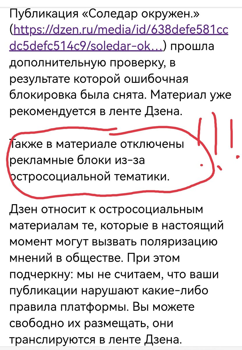 Веселые дела, однако творятся. Пишу статью о нашей победе в Соледаре и она вдруг оказывается заблокированной. Пишу вторую, аналогичную. Через несколько часов она тоже оказывается заблокированной, а на блокировку первой мне отвечают так Мне может кто-нибудь сказать Как можно победу отнести к остросоциальной тематике???? То есть, модераторы хотят сказать, что кто-то против нашей победы и это поляризирует общество? А вторая статья? Я уже модераторам писала, что у меня уши маленькие, с них все падает, поэтому в алгоритм я не верю. Больше верю в пресс-службу Евгения Пригожина. С атакой ботов вообще все интересно. Первая волна пошла, когда я написала, что собираю документы для суда, прокуратуры и других органов, но всплеск получился после того, как я назвала этих ботов птицами царя Дадона (ну, вы поняли, кем) в письме в поддержку с просьбой повлиять на канал ботов. Поддержка отписалась стандартными фразами, зато боты забились в конвульсиях. Такое ощущение, что я секретное их имя озвучила.