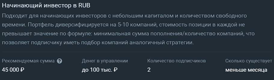 Капитал: Минимальная сумма для автоследования 20 000 ₽ , рекомендуемая 45 000 ₽.