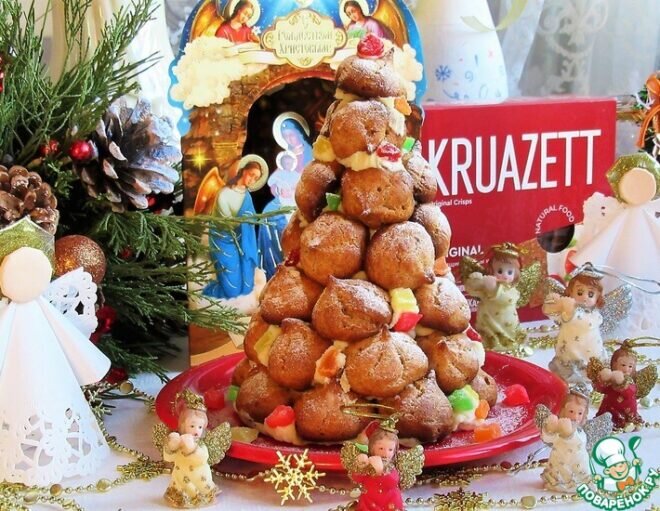 Французский торт из профитролей под названием «Крокембуш» (фр. Сroquembouche) готовят как правило на свадьбы, крестины или Рождество. Торт собирается из маленьких пирожных в виде конуса и так похож на новогоднюю ёлку, что я решила его приготовить на праздниках. Тесто для профитролей готовила с добавлением муки из ржаных хлебцев Kruazett, которые придали более насыщенный цвет пирожным и дополнительный вкус, а нежный крем заварила на кокосовых сливках. Очень красивый, изысканный торт с французским шармом. Угощайтесь!