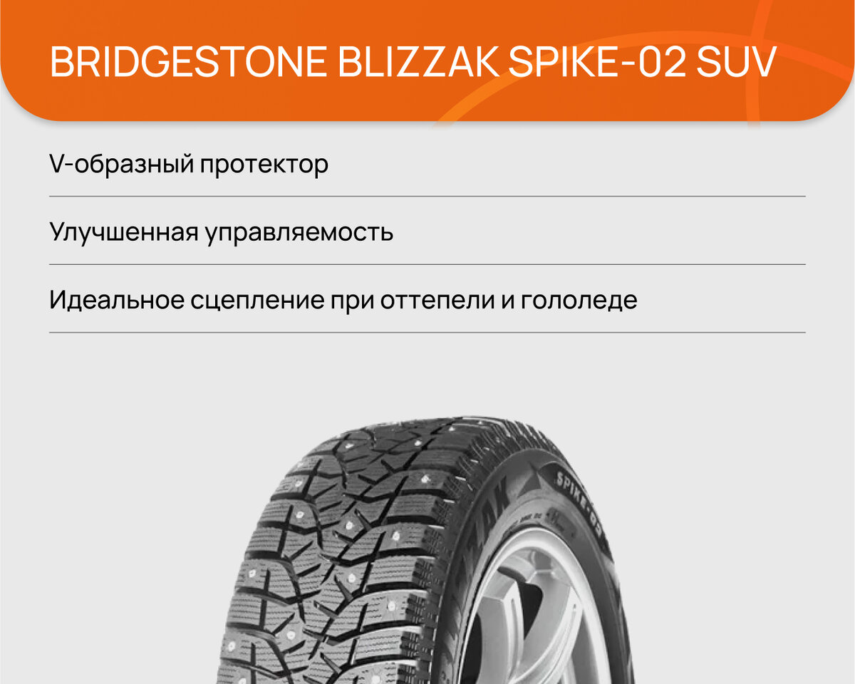 Зимняя шипованная шина Bridgestone Blizzak Spike-02 SUV представляет собой модернизированную версию одноименной модели для легковых автомобилей. Будучи предназначенной для кроссоверов и внедорожников, отличается иными типоразмерами и измененным каркасом, приспособленным для эксплуатации на автомобилях с увеличенным из-за полноприводной трансмиссии весом. Шина разрабатывалась для эксплуатации в непростых дорожных условиях стран Северной Европы и России. Большая часть адаптации к ним пришлась на дизайн протекторного рисунка. Он отличается V-образным строением, благодаря которому пятно контакта располагает многочисленными очень длинными сцепными кромками. Они сходятся под углом в центральной части, чем с одной стороны обеспечиваются отменные сцепные свойства при продольных ускорения, а с другой — курсовая устойчивость и точность управления при маневрировании, особенно на заснеженном и обледенелом покрытии. Протектор шины остается очень эластичным при температурах, значительно ниже 0 градусов по Цельсию. Это позволяет ему плотно облегать даже самое гладкое дорожное покрытие, цепляясь за мельчайшие неровности на поверхности. В результате обеспечивается идеальные сцепные свойства, как при оттепелях, так и при сильном гололеде.
