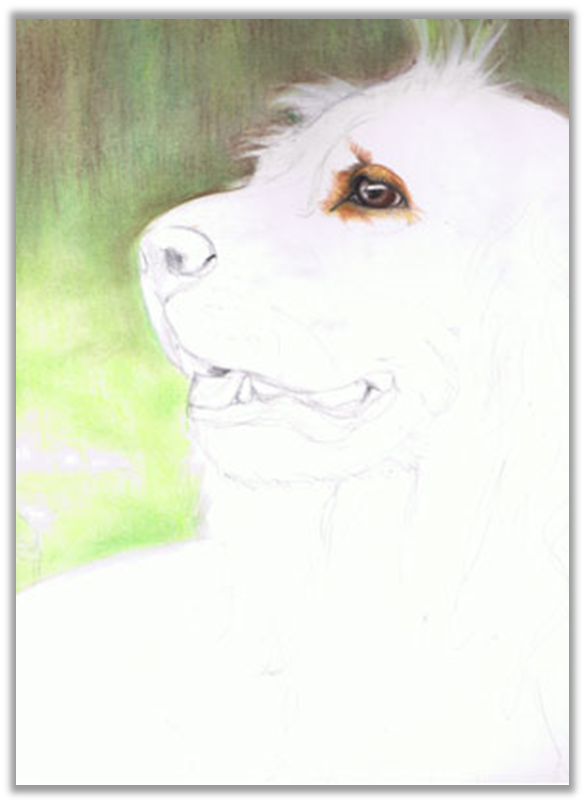 Теперь уши, шерсть на них длинная, поэтому штрихи делаем длинными, заранее намечая каждый локон.