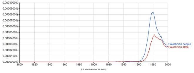 В нашем случае ключевыми словами являются фразы: «палестинское государство», «палестинский народ». При их вводе Ngram немедленно выдаст график, который разочарует противников Израиля. Данные понятия до 1960 года в мировых печатных изданиях не встречаются. Для сравнения можно задать тот же запрос относительно французского государства и народа. Разница в упоминаниях окажется очень существенной. Полученный результат принципиально не изменится, если вопрос Google задавать на другом языке.