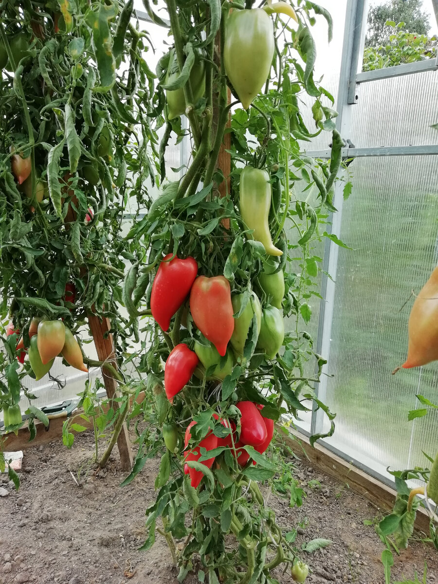 Потрясающий сорт томата "КОРЕЙСКИЙ ДЛИННОПЛОДНЫЙ". Когда посадили первый раз, сначала впечатления не произвёл. Растёт кустик, высокий, листья пониклые, ветки не толстые, тоже кажутся слабенькими. Потом зацвел, появилось очень много завязей, но ничего особенного не происходило. А вот когда плоды начали расти, куст преобразился! Куда только делась угловатость и неприглядность. Лавина крупных удлинённых плодов! Вот такой очень вкусный красавец. Знакомые, зайдя в парник, обязательно на нём останавливали своё внимание. Отличный сорт. Плоды малиновые, примерно 7-10 сантиметров длиной, в диаметре от 4-5 сантиметров и больше. Кожица тонкая, плотная, но не грубая, лежат хорошо. Не растрескиваются. Отлично дозревают и хранятся. Мякоть сочная и сладкая.