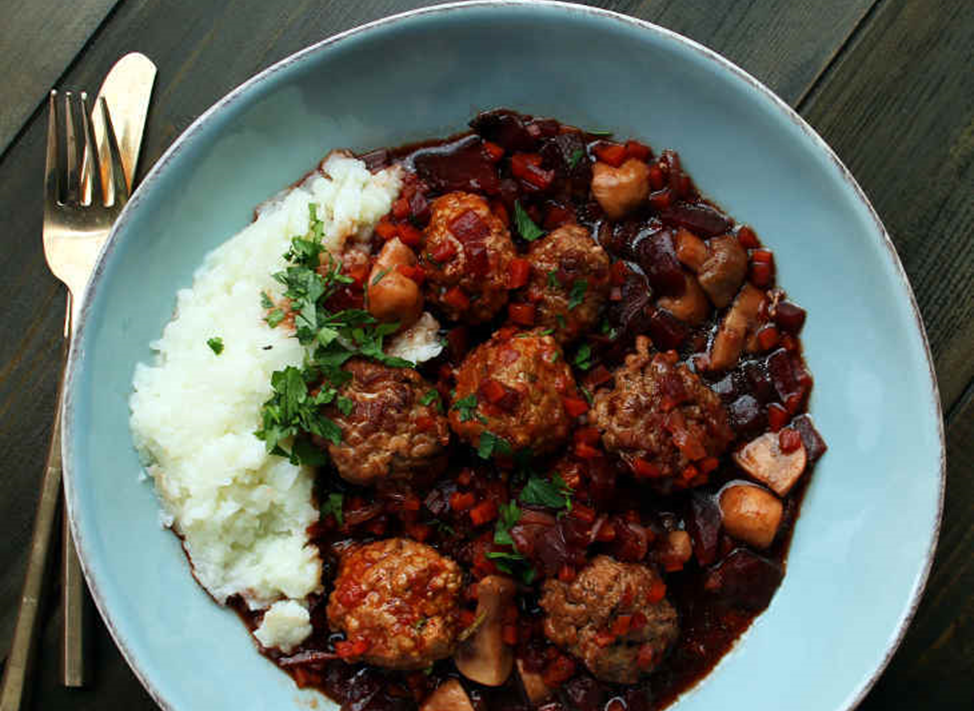 Это вкусное, сытное блюдо сочетает в себе землистый вкус свеклы и сладость моркови. Это отличный вариант на ужин, потому что вы можете положить его в мультиварку и забыть о нем. Рецепт подходит для АИП. Время подготовки: 20 мин Время приготовления: 3 ч 20 мин Порции: 2 Категория: ужин, закуска ИНГРЕДИЕНТЫ · 400 г бараньего фарша · 3 столовые ложки оливкового масла · 1 средняя луковица, нарезанная мелко · 120 белых шампиньонов, нарезанных на четвертинки · 50 г моркови, очищенной и нарезанной мелкими кубиками · 160 г свеклы, очищенной и нарезанной мелкими кубиками · 2 столовые ложки красного винного уксуса · несколько веточек тимьяна · 2 веточки розмарина · 1 стакан говяжьего бульона ( 240 мл) · соль по вкусу · пюре из цветной капусты, для гарнира · петрушка, нарезанная для украшения Приготовление: 1. Приправьте бараньего фарша солью и сформируйте небольшие шарики по 30 г. 2. Разогрейте половину оливкового масла и обжарьте фрикадельки, пока они полностью не подрумянятся. Снимите со сков
