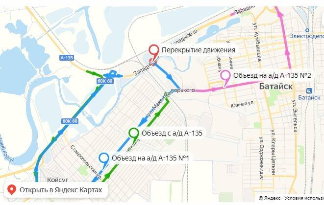 Ремонтные работы продлятся до начала февраля, а местным жителям предложены альтернативные маршруты. В Ростовской области с четверга, 12 января, на 6-м км Западного объезда донской столицы будет закрыт съезд с федеральной трассы А-135 на ул. Фермерскую города Батайска. Об этом сообщила пресс-служба ФКУ «Упрдор Москва-Волгоград». Причиной закрытия названы ремонтные работы, цель которых — приведение к нормативу данного съезда в рамках капремонта участка Западного подъезда к Ростову и устройство переходно-скоростных полос для обеспечения безопасного поворота в Батайск и выезда из города. Сообщается, что съезд будет закрыт на все время проведения работ — до начала февраля. Для местных жителей «проработаны альтернативные маршруты движения». В частности, дорожники предлагают попадать в Батайск со стороны Западного жилого массива через азовскую развязку и далее по улице Грузинская, а из Батайска на Западный подъезд к Ростову — через улицы Максима Горького и Энгельса. В ФКУ «Упрдор Москва-Волго