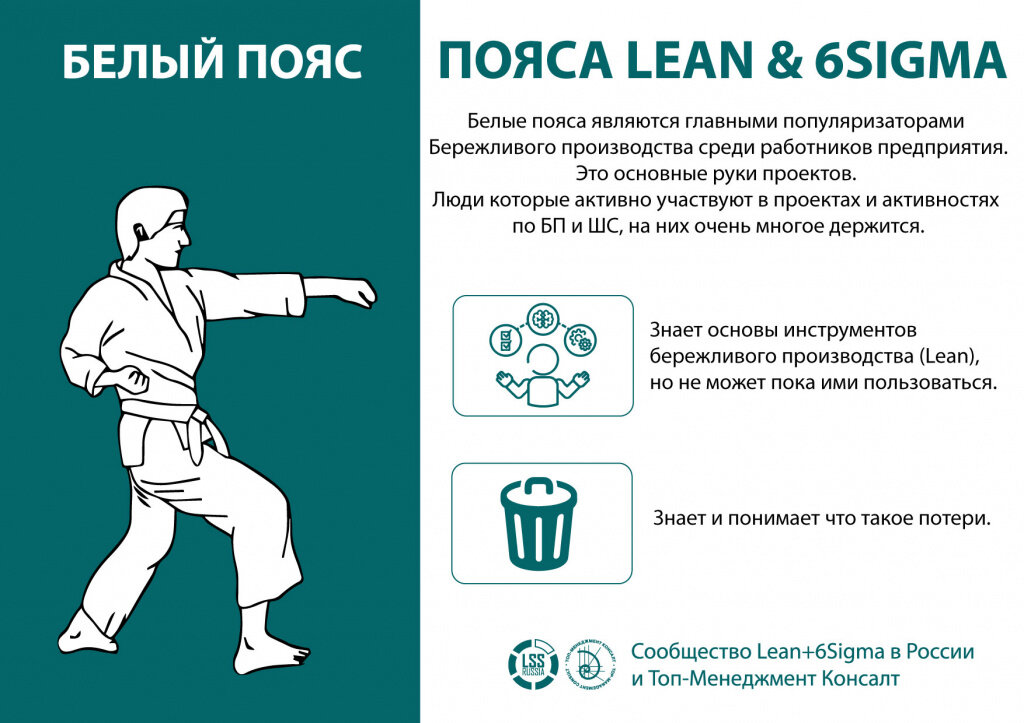 Освоение инструментов бережливого производства, 6 sigma и навыков их использование разбито на определенные уровни или пояса (по аналогии с восточными единоборствами). Пояса могут быть: белый, желтый, зеленый, черный и мастер черного пояса.