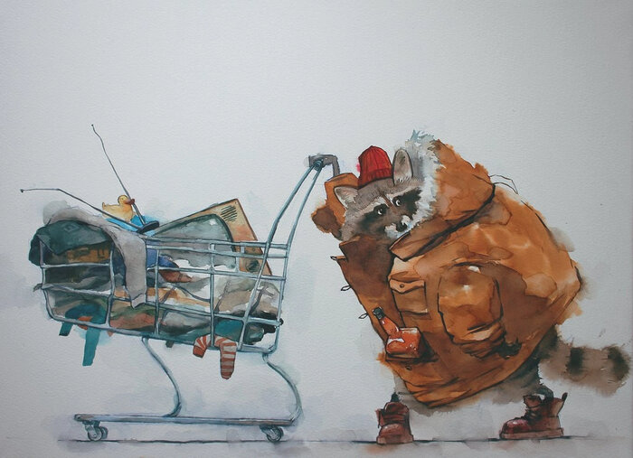 Енот-бомжатка в акварельном исполнении.Все жизненно, я добавил лишь несколько атрибутов настоящего бездомного.Самое основное-это внешний вид, хотя его можно перепутать с хипстером.Помимо одежды, енот согревается особым коктейлем, замешанным из множества алкоголя, найденного в процессе сбора полезных предметов.акварельный эскиз, с удовольствием сделал бы на холсте. Читайте также.
