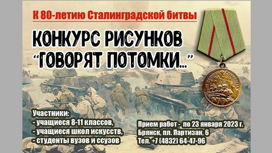 Брянский краеведческий музей проводит конкурс рисунков «Говорят потомки». Он посвящён 80-летию Победы в Сталинградской битве. Принять участие в нем могут все желающие учащиеся с 8 по 11 классы общеобразовательных школ, а также школ искусств, студенты высших, средних учебных заведений и художественных училищ. Чтобы принять участие в конкурсе, необходимо создать рисунок в любой удобной технике. Он может быть написан как акварелью, гуашью, пастелью, карандашом, так и акриловыми красками, углём или маслом. Важным пунктом является то, что работа должна отражать подвиг советского народа в разгроме врага под Сталинградом, быть посвящена памятным местам или лицам, сыгравшим свою роль в данном историческом событии. Подать заявку надо до 23 января по адресу: площадь Партизан, дом 6, кабинет № 8. Лучшие работы будут сформированы в выставку в Брянском краеведческом музее, которая будет работать со 2 февраля. 12+ ФОТО: Брянский государственный краеведческий музей В Брянске проходит конкурс рисунков