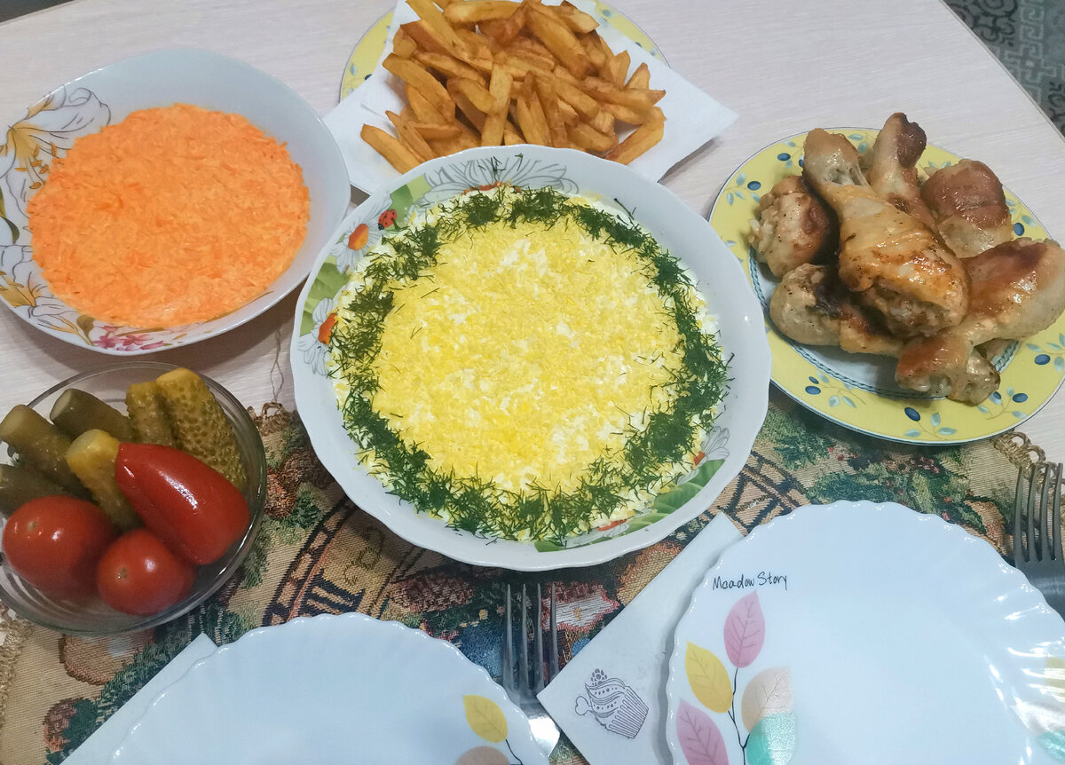 Всем большой привет, дорогие друзья 🤗 Сегодня мой муж приехал домой. Это вынужденный приезд, так как у него заканчивается страховка. Но он решил остаться на свой День рождения 13 января. Всё-таки 35 лет, как никак 🥰 Если честно, за то время, пока мы вместе, его День рождения мы не отмечали ни разу. Всегда работа на первом месте 😞 Ну а по приезду мужа я всегда готовлю стол, это уже традиция☺️ На фото: салат "Мимоза", салат "Морковь с чесноком", картошка фри, запечённые куриные голени и соленья😋 Конечно, много осталось . Это очень хорошо, потому что завтра мне будет некогда готовить. Составили меню и список покупок. Завтра поедем закупаться, и я начну уже готовить слоёные салаты 😋 Пригласили родственников по минимуму и друзей🤗🥰 Итак, наше меню: 1. Салаты и закуски 2. Горячее 3. Десерт 4. Напитки Может быть, чего-то не хватает? Как Вам кажется? Благодарю Вас за подписку и 👍👍👍🤗🥰