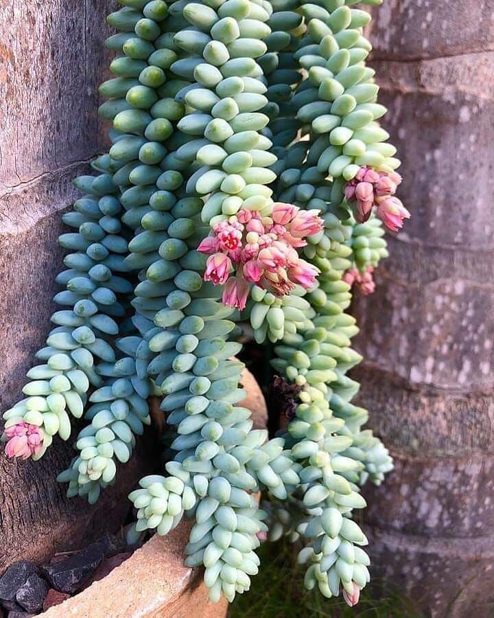 Хвост ослика или ослиный хвост ( Sedum morganianum ) — это висячий суккулент, который лучше всего смотрится в подвесной корзине или контейнере, стоящем на выступе, полке или подставке для растений, чтобы его можно было задрапировать. Каждый стебель может достигать трех футов в длину и усеян серо-зелеными листьями размером и формой с пухлое рисовое зернышко. На листьях есть бледный блеск, который стирается, когда вы прикасаетесь к ним, и на нем видны ваши отпечатки пальцев. Кроме того, листья хрупкие, легко опадают, поэтому лучше избегать контакта с этим растением, насколько это возможно.