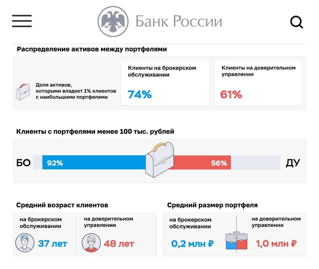 Это статистика российских инвесторов по различным данным. 96,7% инвесторов управляют капиталом сами через брокера, а 3,3% пользуются доверительным управлением.