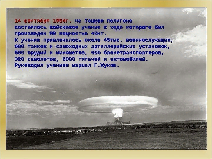 Войсковое учение с применением атомного оружия 14 сентября 1954 г. состоялось после принятия правительством СССР решения о развертывании подготовки Вооруженных Сил страны к действиям в условиях реального применения вероятным противником ядерного оружия. Принятие такого решения имело свою историю. Первые разработки предложений по этому вопросу на уровне ведущих министерств страны относятся к концу 1949 г. Это было обусловлено не только успешно проведенными первыми ядерными испытаниями в Советском Союзе, но и влиянием американских средств массовой информации, питавших нашу внешнюю разведку сведениями о том, что Вооруженные Силы и Гражданская оборона США активно проводят подготовку к действиям в условиях применения ядерного оружия в случае возникновения вооруженного столкновения.