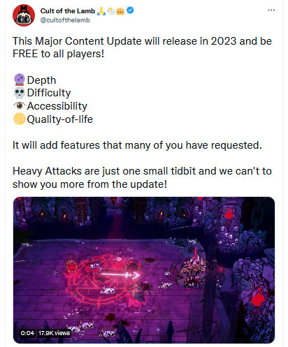 Студия Massive Monster рассказала о новом контенте, который она готовит для одной из лучших инди уходящего года — рогалика Cult of the Lamb. Команда разработчиков собирается порадовать фанатов дополнительным уровнем сложности, новым видом атаки и другими различными нововведениями, которые станут частью бесплатного крупного обновления в 2023 году. Новые тяжелые атаки позволят игрокам наносить больше урона своим врагам. У каждого вида оружия будет по одному новому типу атаки. Активировать ее можно будет удерживанием кнопки атаки. На официальной странице игры в твиттере вы можете найти короткие геймплейные клипы, в которых показываются тяжелые атаки меча, кинжала и топора. https://twitter.com/cultofthelamb/status/1608891680870260736 Также разработчики заявили, что перед запуском крупного обновления они собираются разобраться с множеством известных проблем, с которыми сталкиваются консольные игроки.