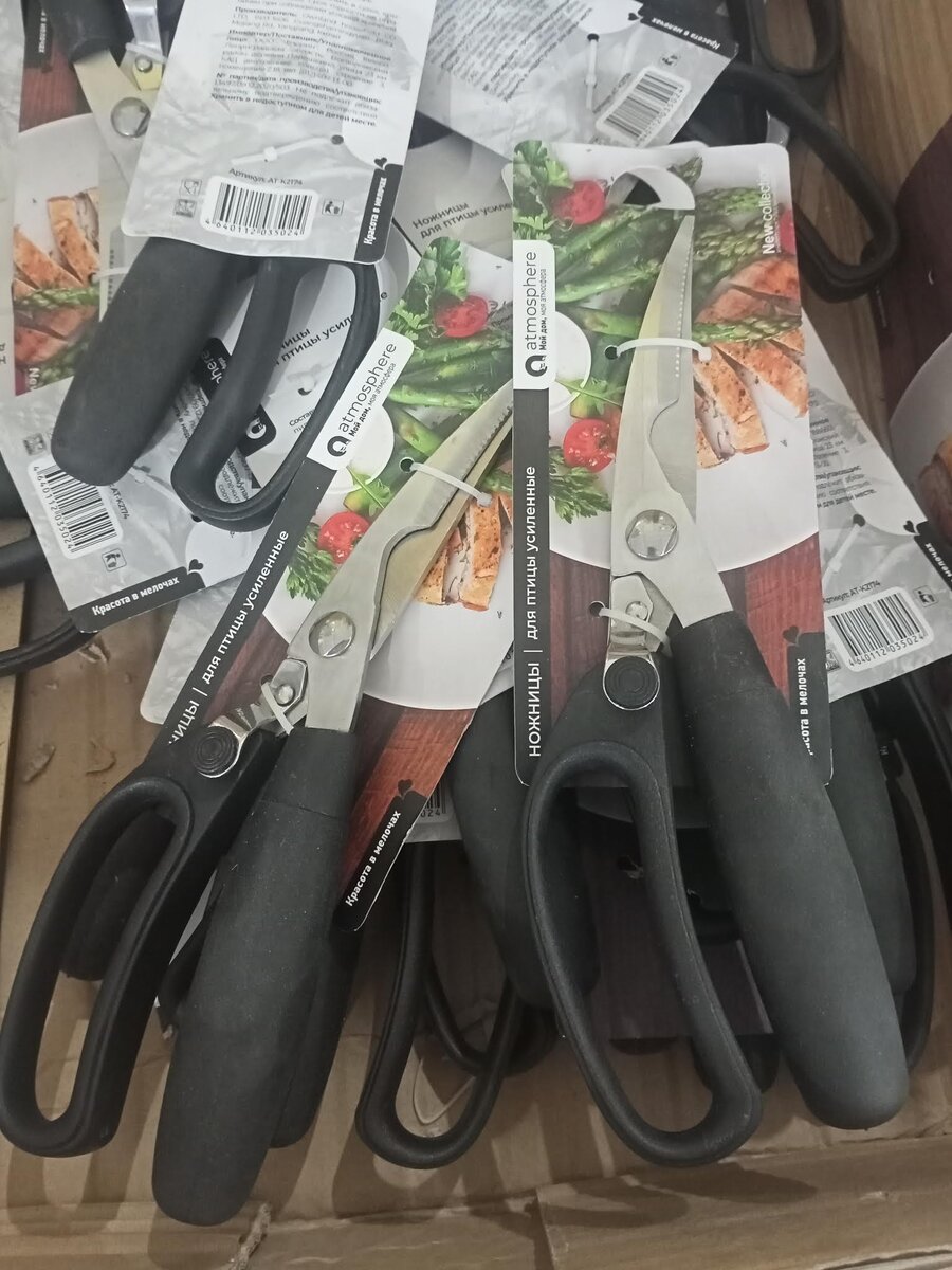 Приветствую вас, уважаемые читатели. Поздравляю вас с Новым Годом. Желаю в наступившем году мира и благополучия. Со вчерашнего визита в Светофор у меня остались неопубликованные фото интересных новинок. Сейчас я поделюсь с вами этими новинками. В продаже увидела такие усиленные ножницы для птицы Atmosphere. Производитель Китай. Стоимость ножниц составляет 205.90. Ножницы очень острые, имеют удобную ручку, сделаны на совесть. Наборы ножей для чистки в пластиковых чехлах Calve. Производитель Китай. Набор состоит из 3 ножей, длина лезвия ножей 9 см, цена набора 239.90. Ножи такие приобрели, неплохие, хорошо режут, удобная ручка. Разделочные доски с литографией, в ассортименте. Российское производство. Размер доски 21×29 см, цена 77.90. Расцветки очень красивые, а вот качество не очень хорошее. Доски быстро теряют форму, начинают крошиться, рисунок начинает облазить через несколько дней использования. Терки из нержавеющей стали Calve. Производитель Китай. Терка шестисторонняя, высотой 22 с