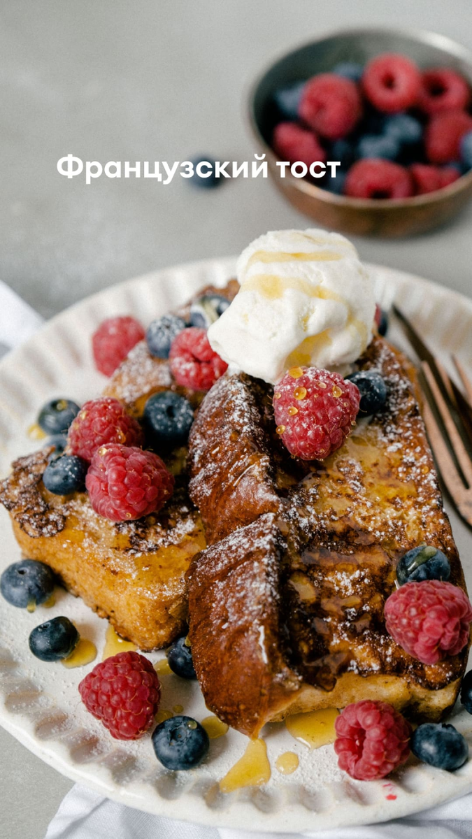 10. мёд, ягоды по вкусу Пошаговое приготовление: 1. Взбить яйца с сахаром, корицей и ванилью 2. Влить молоко и добавить мускатный орех 3. Булку или батон разрезать на толстые ломтики. 4. Окунуть каждый кусочек в яичную смесь на 1–2 минуты 5. Растопить сливочное масло на сковороде 6. Обжарить тосты на среднем огне до золотистой корочки 7. При подаче полить мёдом, украсить ягодами и мороженым Приятного аппетита! Если вам было полезно, то ставьте лайк и подписывайтесь! благодарю всех и ценю! Спасибо заранее!