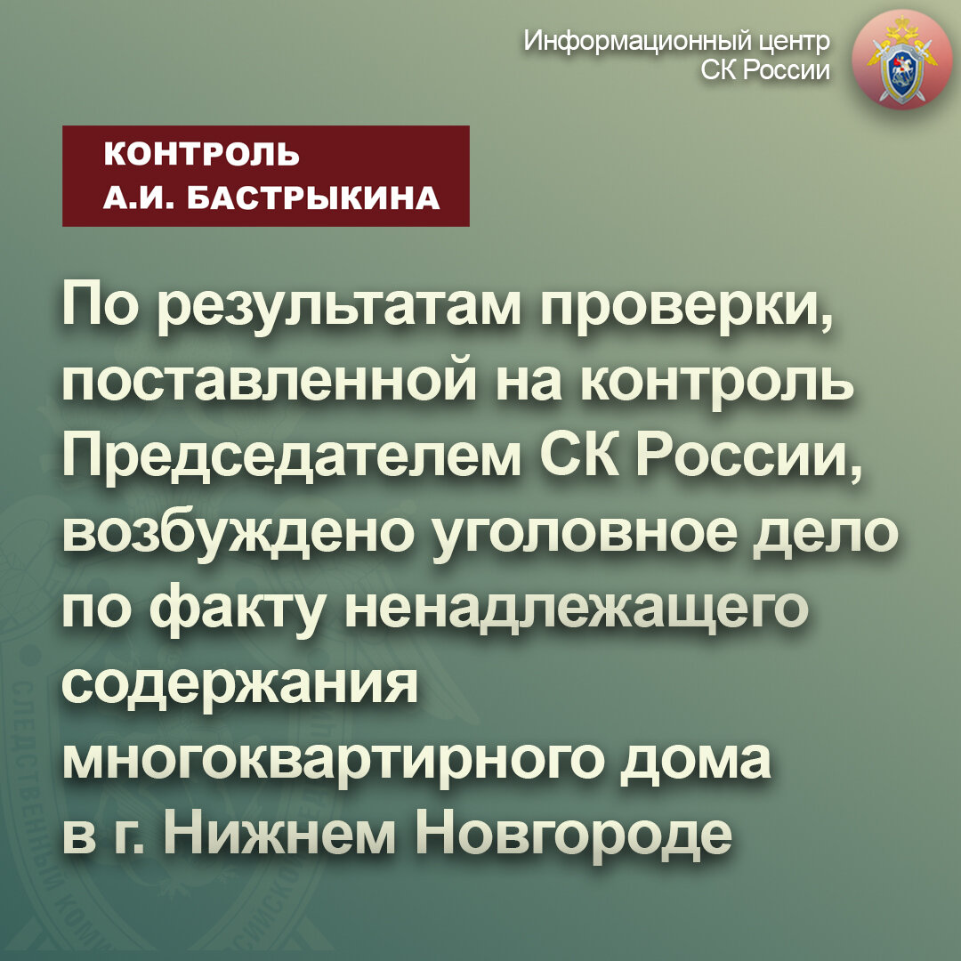 По результатам проверки, поставленной на контроль Председателем СК России, возбуждено уголовное дело по факту ненадлежащего содержания многоквартирного дома в г. Нижнем Новгороде