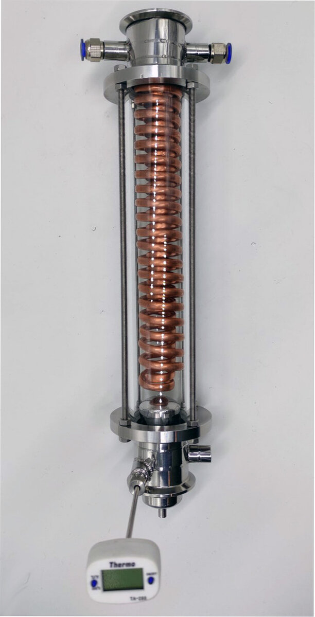 В общем, не знаю зачем, но вместо обычного прямотока мне приспичило установить на куб для перегонки джина такую вот конструкцию, как на рисунке. Да ещё и поверх небольшого укрепления из одного пыжика медной СПН. Отобрав 50 мл "голов", я открыл крантик узла отбора на полную, однако прекратить возврат флегмы на насадку мне не удалось. Не велика, конечно же, колонна, однако при отгоне ароматного дистиллята никакой тепломассообмен не предусмотрен. Вообще никакой. И вот сижу я и думаю: "А нафига вообще я этим занимаюсь?" Но наш девиз а посему начатое необходимо довести до конца. К моменту значительного снижения отбора в силу банального окончания спирта в кубе начинаются "тряпки" - неприятный запах варёных шишкоягод, приправленный истончающимся и искажающимся ароматом всего остального. В этот раз ничего подобного не произошло. Спиртуозность плавно снизилась и из отбора тонкой струйкой побежала сладкая ароматная водичка. Её я решил отобрать отдельно, чтобы разбавить полученный 74% дистилля