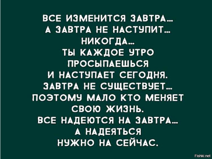Жизнь не простая штука. Она имеет свои законы. Один из них гласит, что всему своё время. И это так, если мы с вами посмотрим на то, что весной сеют, а осенью собирают урожай. Но есть и ещё один закон, который говорит человеку, что не нужно откладывать на потом то, что можно сделать сейчас. Именно о втором законе и пойдёт речь. Люди идут по своей жизни, каждый из нас своего рода путешествует по Земле. Мы не знаем, что будет завтра, это первое. Мы не ведаем, который день станет завершающим в этой жизни не только у нас, но и у других людей. Любой поступок это возможность сделать этот мир чуточку лучше. Даже наше утреннее "здравствуйте" энергетически делает другого человека светлее и здоровее. Так почему же нужно откладывать что-либо на потом, если жизнь нам предлагает это сделать сейчас? Если душа поёт, а сердце ёкает, то делайте то, что возможно по вашим мыслительным меркам, сделать завтра. Хотите вручить подарок любимому человеку сегодня, делайте это без официального повода. А потому чт