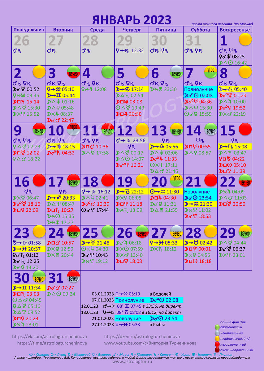 И вот он настал - Новый Год! Поздравляю Вас с Наступившим 2023 годом! А чтобы моим подписчикам было легче сориентироваться и успеть заранее продумать свои первые шаги в Новом году, я, в качестве новогоднего подарка, публикую мой астрологический календарь сразу на месяц 💥🎉🥳 В астрологическом календаре все просто — каждый день недели помечен определенным цветом, который показывает общий фон этого дня (благоприятный, напряженный и т.д.), что очень удобно при планировании дел! (Время по Москве). Для тех, кто хочет приобрести электронный астрологический календарь на каждый день 2023 года ссылка на календарь