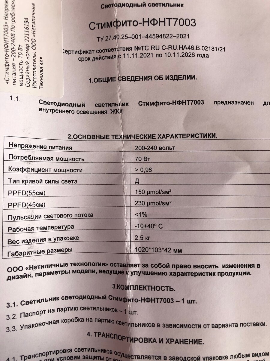 Несколько лет подряд мы пытались вырастить дома редиску. Но толком из этой затеи ничего не получалось. Естественно, что каждый раз использовали подсветку, но делали это обычными тоненькими лампами (которые как бы в одну полоску на 9-15 Вт). Никому не хочется делать антирекламу, но света просто банально не хватало и плоды не завязывались, а растение просто вытягивалось. И вот в этом году на день рождения мне подарили вот этот агрегат. Чтобы не описывать параметры, я специально приведу просто фото технического талона. Хотя Вы уже, наверное, поняли, что никому никакой рекламы я делать не собираюсь в своих публикациях, а пишу лишь про свой опыт. Ну что обычно интересует - мощность и габариты. Мощность - 70 Вт, а длина чуть больше метра. И буквально на следующий день мы посадили семена редиса "Мечта Алисы". По заверениям всех садово-огороднических сайтов этот сорт вырастет даже в полной темноте. Итак, посев был произведен 10 декабря. Грунт - свой перегной первого года смешанный с Агробал