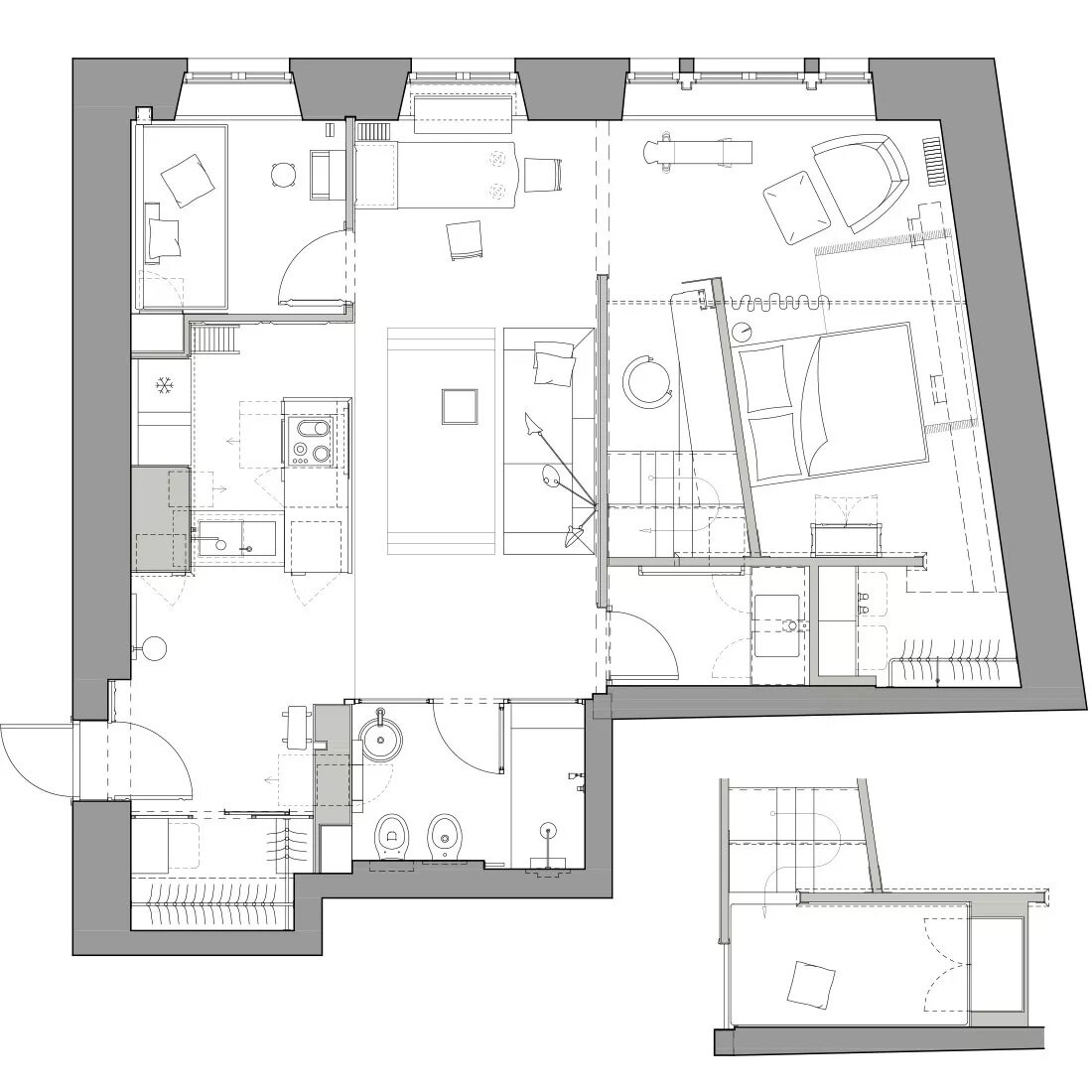 Дизайнеры Петр Григораш и Дарья Блаженкова оформили евротрешку 70 м² в старом здании 1902 года. В интерьере необычно сочетали сохранившиеся исторические детали обстановки и современные решения. Планировка Заказчики просили спроектировать приватную зону и открытое общее пространство. Кухню, столовую и гостиную совместили, к ним также прилегает прихожая. За неглухой перегородкой, которую не стали доводить до потолка, чтобы сохранить больше света и воздуха, обустроили спальню, мини-кабинет и гардеробную. Также предусмотрели небольшую гостевую комнату и надстроили хозяйственный антресольный этаж над кладовкой. Кухня-гостиная Зону гостиной обозначили бирюзовым ковром и историческим паркетом, которым отделали акцентную стену за диваном. Покрытие обнаружили в квартире во время демонтажа. Чтобы подчеркнуть дух времени, с него не стирали пыль, а законсервировали вместе с ней, используя специальную технологию. Дополнительно поверхность обработали лаком. Нейтральные белые стены выделяются фак
