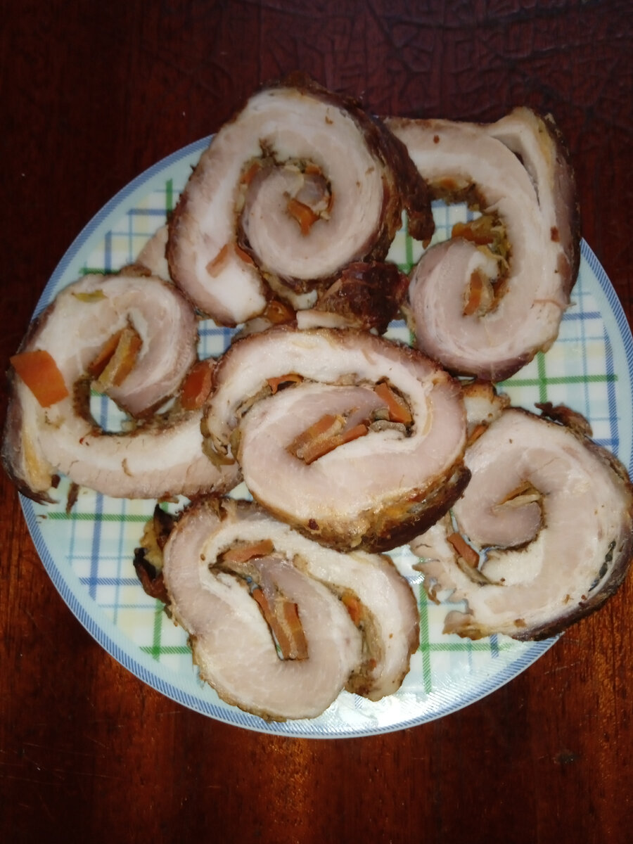Свинину нарезать на плоские куски толщиной около сантиметра. У меня получилось шесть рулетиков. Отбить куски свинины с двух сторон. Нарезать морковь и чеснок плоскими кусками. Мясо посолить и поперчить. Я добавляю паприку, чёрный и красный молотый перец. Куски мяса необходимо тщательно натереть солью и специями. И оставить на полчаса. Затем свернуть мясо в рулет. Внутрь рулета вкладываем морковь и чеснок попеременно. На самый край рулета ничего не кладём. Рулет обвязать. Сложить рулеты в рукав для запекания и отправить в духовку на два часа при температуре около 200 градусов. Рулеты готовы. Эти рулеты необходимо сначала остудить. Если резать горячими, то они разваливаются. Приятного аппетита. С новым годом!
